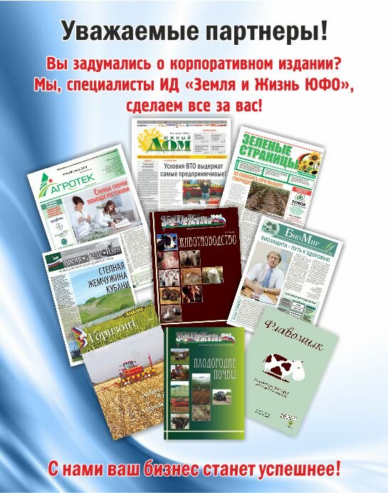 Издательский дом «Земля и жизнь ЮФО» предлагает вашему вниманию специальные проекты. Нужна корпоративная или тематическая газета? Требуется рекламный буклет или проспект? Вы обратились по адресу! Уже несколько лет мы выпускаем специализированный журнал «Животноводство», ведем тематические и корпоративные издания «Агротек», «Биомир» и «Зеленые страницы». В ближайших планах – выпуск спецприложения по растениеводству, а также справочника учебных заведений, готовящих специалистов для сельского хозяйства.