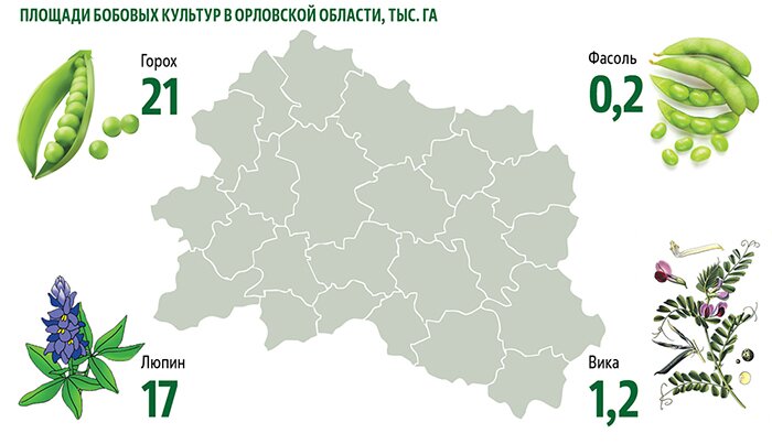 По информации Росстата по Орловской области, бобовые культуры в регионе сеют на площади около 40 тысяч га. Снижение площадей произошло в прошлом году примерно на треть по сравнению с уровнем 2019 года. Такая тенденция сложилась в связи с расширением посевов масличных, кормовых и зерновых культур. Лидер среди бобовых – горох, эта культура занимает чуть более 21 тысячи га, на втором месте люпин – около 17 тысяч га, вика занимает 1,2 тысячи га, фасоль – 0,2 тысячи га. Незначительные площади отведены под нут и чечевицу.
