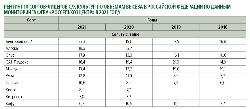 В Краснодарском крае доля импортных семян по всем направлениям составляет 35%. Россельхозцентр составил рейтинг 10 лучших сортов сои по объемам высева в Российской Федерации по данным мониторинга за 2021 г. (см. таблицу).