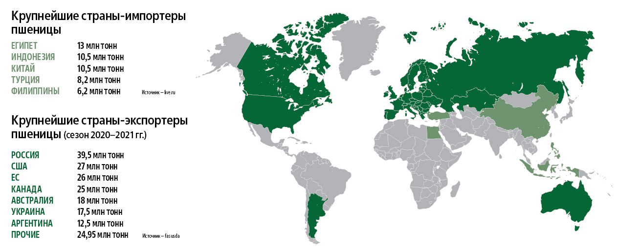 В целом прогнозы на мировой урожай неплохие. В мире сегодня производится достаточное количество зерна. Но проблема в том, что большая часть этого зерна потребляется внутри стран-производителей, и некоторые государства вообще не продают пшеницу — либо так сложилось исторически, либо из-за ситуации в этом году. Например, Китай, который является крупнейшим производителем пшеницы, скорее всего, в этом году не будет продавать зерно. Впрочем, он вообще его не продает, им самим не хватает. Индия, второй производитель зерна в мире после Китая, экспортирует зерно не ежегодно. В этом году страна ввела мораторий на продажу зерна, чтобы стабилизировать внутренние цены.
