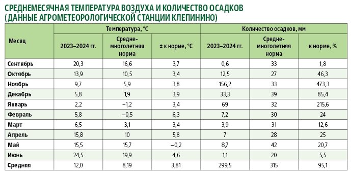 Погодные условия вегетационного периода 2023–2024 годов оказали как положительное, так и отрицательное влияние на рост и развитие сельскохозяйственных культур. Наиболее неблагоприятным фактором, повлиявшим на озимые в начальный период их развития, были засушливые условия предпосевного и посевного периодов, никак не способствовавшие появлению своевременных всходов. После уборки предшествующей культуры период без хозяйственно полезных дождей длился более трех месяцев и закончился во второй декаде ноября.