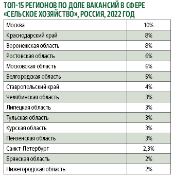 Регионы-лидеры по числу вакансий в сельском хозяйстве