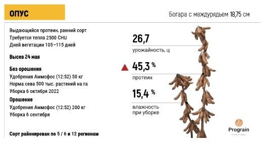 На орошении из раннеспелых сортов отличился сорт Сиберия («Прогрейн»), который дал самый высокий урожай на поливе — 38 ц/га. Самый высокий протеин на орошении продемонстрировала, опять же, соя сорта Аляска — 46 %.