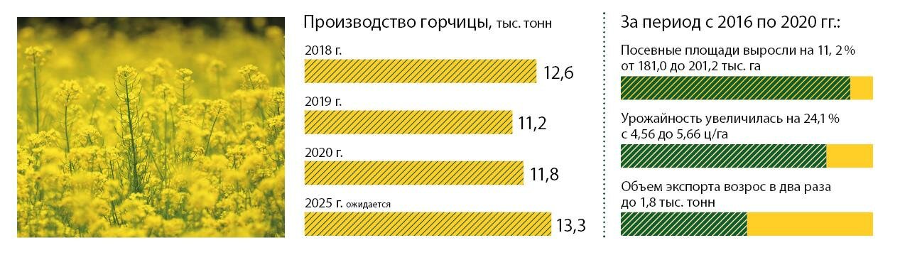 Экспорт горчицы относительно невелик. Это свидетельствует о том, что производство в основном ориентировано на внутренний рынок, хотя объемы экспорта продукции ежегодно растут и за 2016–2020 гг. увеличились более чем в два раза, до 1,8 тыс. тонн. По посевным площадям горчица у нас в стране занимает пятое место, уступая подсолнечнику, сое, рапсу и льну. Ее площади стабильны: 150–200 тыс. га.