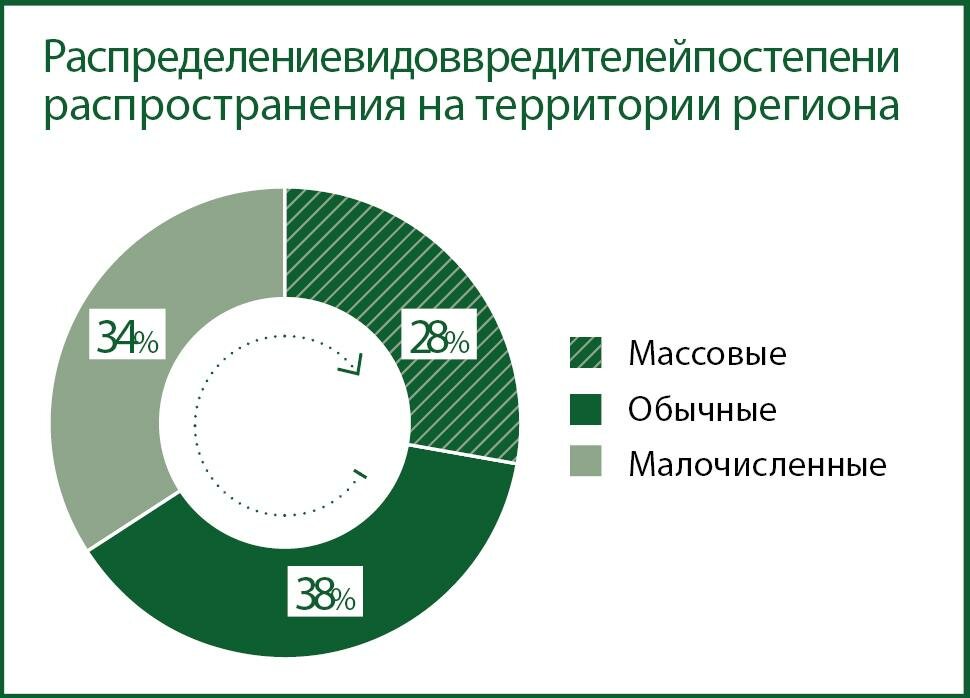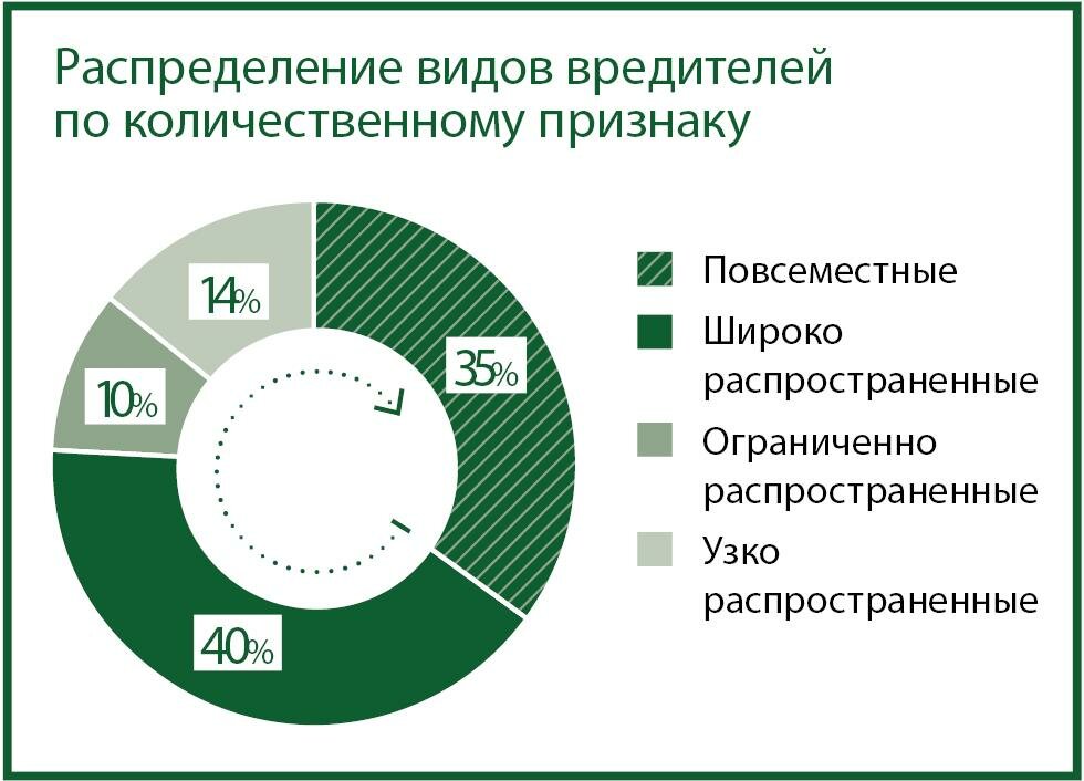 По вхождению точек обнаружения вредителей в разные зоны выявленные в регионе виды отнесены к четырем группам. Обнаруженные во всех зонах составили группу повсеместных, в трех — широко распространенных, в двух — ограниченно распространенных, в одной — узко распространенных. В случаях обнаружения вида в несмежных зонах расположенная между ними также считалась входящей в ареал. В таких случаях виды были отнесены в вышестоящую группу.