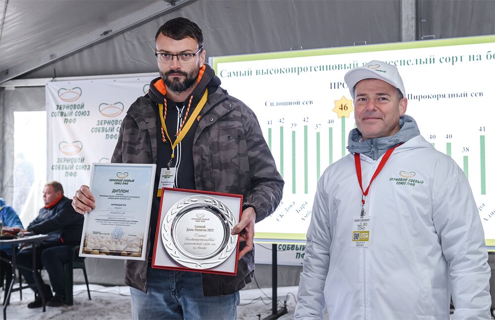 «ГК «Агротек» представлял на демополигоне 11 сортов из 30: шесть сортов селекции «Прогрейн» и пять — «Русской Генетики». Наши сорта взяли четыре призовые номинации. Другие селекции тоже показали свои сильные стороны. Хорошо себя проявили сорта и у нашего партнера «СААТБАУ». Некоторые из них очень ярко выделились с урожайностью за 30 ц/га и с хорошим протеином. Кстати, протеин выше, чем у «Прогрейна», ни одна селекция не показала. Но урожайность сортов других компаний в некоторых местах была на весьма достойном уровне», — рассказал руководитель направления «Соя» ГК «Агротек» Александр Овсиенко.