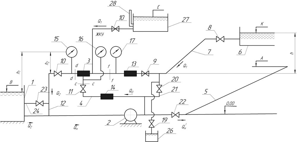 1 — накопитель чистой воды; 2 — насосный агрегат; 3 — смеситель; 4 — трубопровод подачи рабочего расхода к смесителю; 5 — трубопровод подачи смеси навоза с водой на орошаемый участок; 6 — накопитель жидкого навоза; 7 — трубопровод подачи жидкого навоза; 8, 9, 10, 11, 20, 22, 23 — задвижки; 12 — трубопровод подачи жидкого навоза во всасывающий патрубок центробежного насоса; 13, 14 — расходомеры; 15, 16 — манометры; 17 — мановакууметр; 18 — граница здания насосной станции; 19 — спускной кран; 21 — трубопровод промывки; 24 — трубопровод подачи стоков в накопитель; 26 — дренажный приямок; 27 — емкость для жидкости комплексных удобрений; 28 — пьезометр.