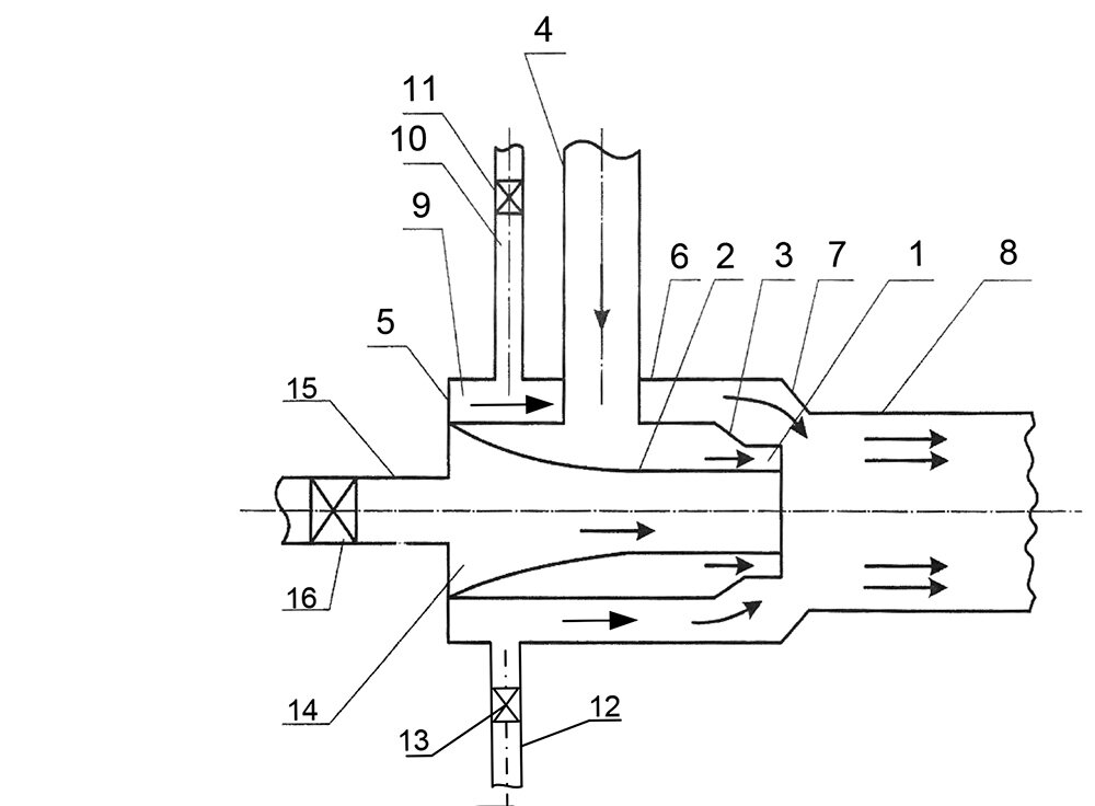 1 — кольцевая щель; 2 — внутреннее сопло; 3 — наружное сопло; 4 — трубопровод подачи воды; 5 — кольцевая заглушка; 6 — полый стакан; 7 — конфузор; 8 — смеситель; 9 — кольцевое отверстие; 10 — трубопровод подачи минеральных удобрений; 12 — трубопровод подачи микроэлементов; 11, 13, 16 — задвижки; 14 — центральное отверстие; 15 — трубопровод подачи животноводческих стоков.