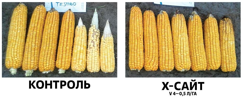 Обработка Х-Сайт в дозировке 0,5–1,0 л/га способствует выполненности початков кукурузы, удержанию большего количества стручков на сое, продуктивному кущению зерновых культур, препятствует абортации продуктивных побегов.