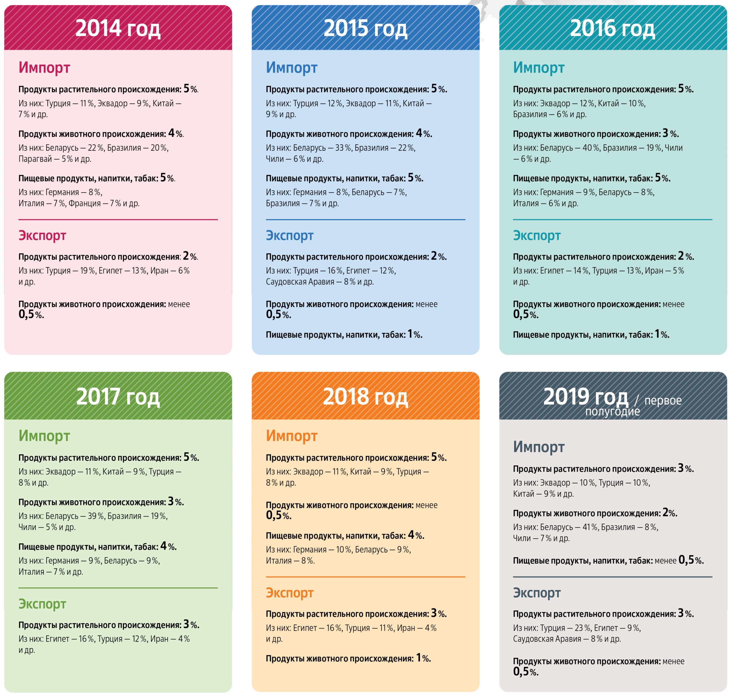 Как отметила в своей статье «Влияния изменений климата на сельское хозяйство в регионах Российской Федерации» кандидат экономических наук Елена Шарко, по данным на 2021 год продукты растительного происхождения преимущественно импортируются из Бразилии, Турции и Китая (с Китаем торговые отношения стабильны и устойчивы — динамика минимальна). Продукты животного происхождения в основном везут в Россию из Беларуси, Бразилии и Чили. Но сам торговый оборот при этом снизился за пять лет с 4 до 2 %. В 2018 году наблюдался пик снижения — до 0,5 %. Пищевые продукты, напитки, табак преимущественно до 2015 года импортировались из стран Европы (Германия — 8 %, Франция и Италия — по 7 %), но с 2015 года импортерами стали Беларусь (9 %) и Бразилия (7 %). С начала 2019 года потребность в импорте снизилась до 0,5 %.