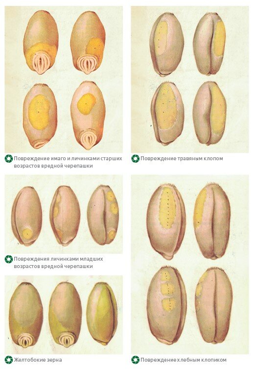 Уколы клопа-черепашки вызывают в зерне различные изменения в зависимости от того, на какой стадии развития зерно подвергалось поражению вредителем. Так, зерно, поврежденное в фазе молочной спелости, приобретает бледно-желтый цвет, бывает обычно щуплым, сморщенным, имеет низкую объемную массу. Зерно, поврежденное клопом в более поздней фазе спелости, по форме не изменяется.