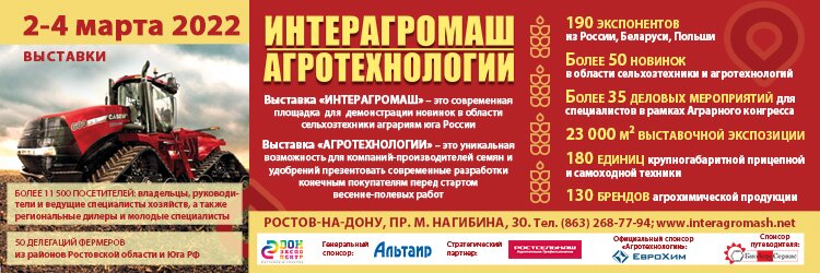 На начало марта намечено проведение выставки «Интерагромаш» & «Агротехнологии», в г. Ростове-на-Дону, где будет демонстрироваться сельскохозяйственная техника, оборудование и материалы для производства и переработки сельхозпродукции. В специальном отделе сельхозтехники будут представлены тракторы, комбайны, кормоуборочная и почвообрабатывающая техника, посевные и погрузочные машины, оборудование для внесения удобрений, защиты растений и прочее, то есть все необходимое для работы на земле.