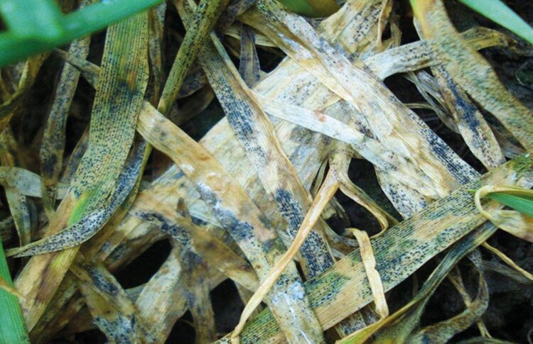 На пораженных листьях появляются некротические точки, которые, разрастаясь, принимают овально-удлиненную форму с серовато-бурым центром и темно-коричневым ободком. Пятна постепенно увеличиваются до такой степени, что лист засыхает. При сильном поражении погибает все растение. Аналогично протекает листовая форма болезни в более поздние фазы — трубкование и выметывание.