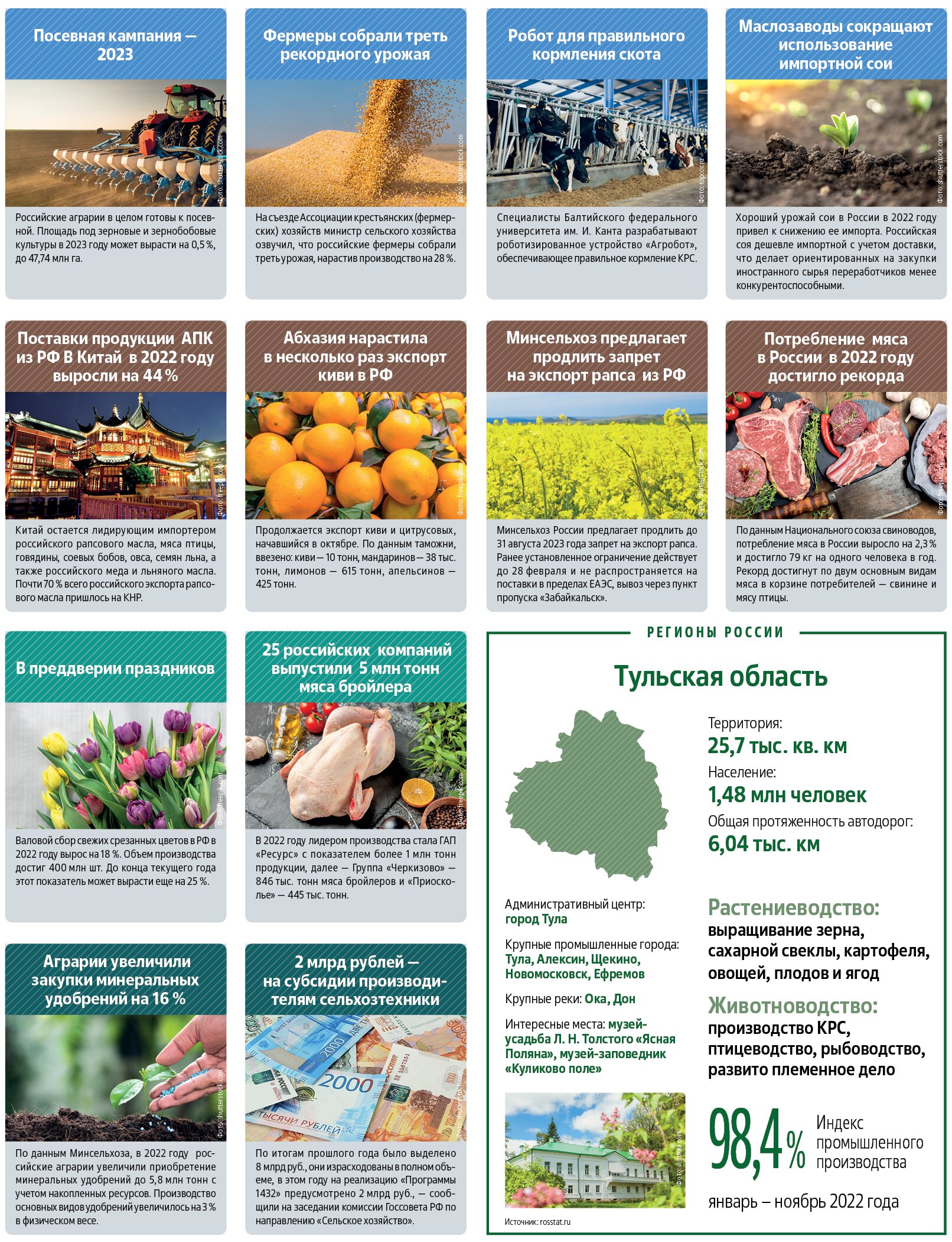 «В первой половине сезона 2022–2023 российская пшеница экспортировалась относительно скромными темпами, не превышающими средние значения. За июль – декабрь 2022 года экспортеры продали 22,7 млн тонн против 23 млн тонн в среднем за последние пять лет. Медленный экспорт был обусловлен укреплением рубля, высокими ставками фрахта и влиянием экспортных пошлин. Рекордный урожай 2022 года также способствовал росту объема запасов. По данным Росстата, в 2022 году собрано 104,4 млн тонн пшеницы, что на 37 % больше, чем годом ранее. Наибольшие запасы пшеницы в 7 млн тонн находятся на юге — ключевом экспортном регионе России, это на 55 % выше прошлогоднего показателя. Самый значительный прирост запасов в годовом выражении наблюдается в Поволжье. Остатки пшеницы здесь составляют 4,4 млн тонн, это в два раза больше, чем годом ранее», — сообщают аналитики.