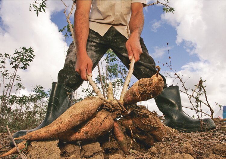 Приемы выращивания культуры несложные: грунт необходим воздухопроницаемый, легкий, нейтральной реакции, с довольно высоким содержанием гумуса, подойдут и суглинки. Эти растения не любят плотных, тяжелых почв и застоя воды, но поливы им нужны. Размножают маниок вегетативно, в виде черенков размером 15–20 см, которые заготавливают из средней части разросшихся стеблей 6–12-месячного возраста. Их хранят два-три месяца в прохладном месте или высаживают в грунт. Сажают обычно в наклонном, горизонтальном или вертикальном положении, главное, чтобы в почве находилось не меньше половины черенка. Если растение размещают горизонтально, нужно, чтобы черенок был укрыт слоем почвы в 8–10 см, иначе саженец пересохнет. Хорошо увлажненный черенок быстро формирует побеги и корнеклубни.