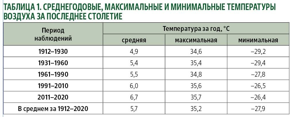 Из таблицы видно, что с 1912 по 2020 годы наблюдалось постепенное увеличение среднегодовой температуры с 4,9 до 6,7 °С. Причем с 1990-го рост этого показателя шел более заметно.