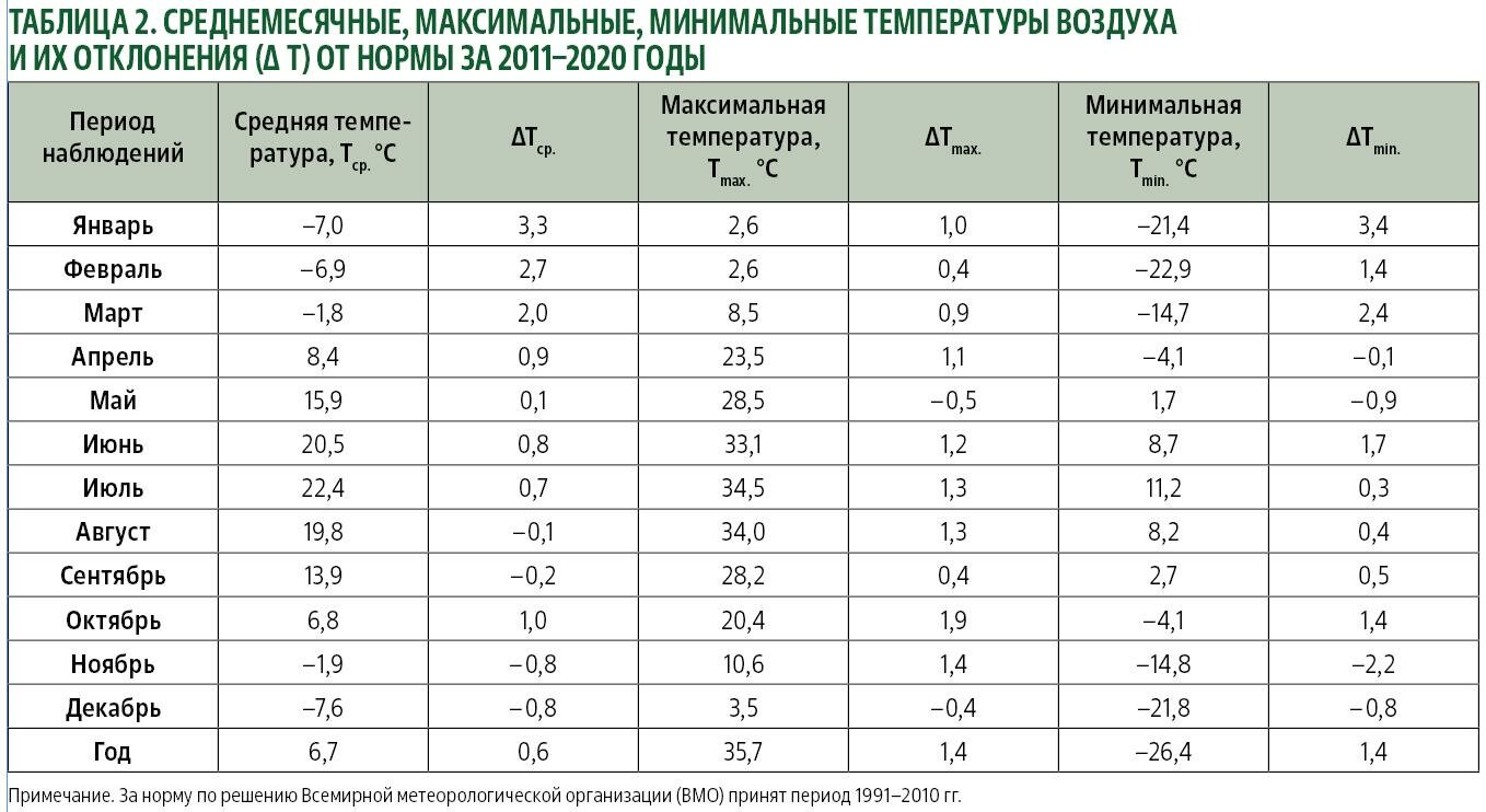 Одновременно прослеживается повышение максимальной температуры с 34,6 до 35,7 °С и минимальной отрицательной температуры с –29,4 до –26,4 °С. Среднемесячные, максимальные, минимальные температуры воздуха и их отклонения (Δ Т) от нормы за 2011–2020 годы приведены в следующей таблице 2.