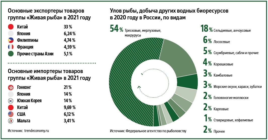 Основная страна экспорта для России — Китай. Это огромная площадка, где рыба перерабатывается и откуда продается по всему миру. Долгое время Россия не могла занять лидирующих позиций в сегменте переработки. Однако введение санкций, с помощью которых Запад начал активно бороться с отечественной экономикой, изменил положение дел. Государство начало вкладываться в рыбное производство, и весьма успешно. В настоящее время российский минтай, особенно замороженный в море, очень востребован в Европе, поскольку считается экологически чистым и имеет небольшую глазировку, в отличие от китайских аналогов. Не менее популярны по тем же причинам и наши лососевые.