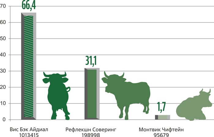 Из 11 быков, оцениваемых по качеству потомства, семь – быки-улучшатели, в разной степени увеличивающие удой дочерей. Так, дочери быка Бархата 5534 превосходили по удою за лактацию сверстниц на 1002 кг молока, Мишеля 801 – на 468 кг, Орлана 3376 – на 380 кг, Парада 3778 – на 156 кг и Альта Тайсона 33528 – на 87 кг. У дочерей быков АльтаР2 16235, Наполеона 9840, Стрельца 54274 и быка № 34760 удой был ниже, чем у сверстниц, соответственно на 800, 50, 99 и 753 кг.