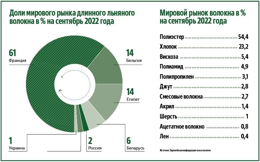 Если говорить о качественном волокне, то на сегодняшний день позиции в мире распределились следующим образом: подавляющий объем длинного льноволокна — 61 % — производят во Франции, в Бельгии и Египте — по 14 %, в Беларуси — 6 %, в России — 2 %.