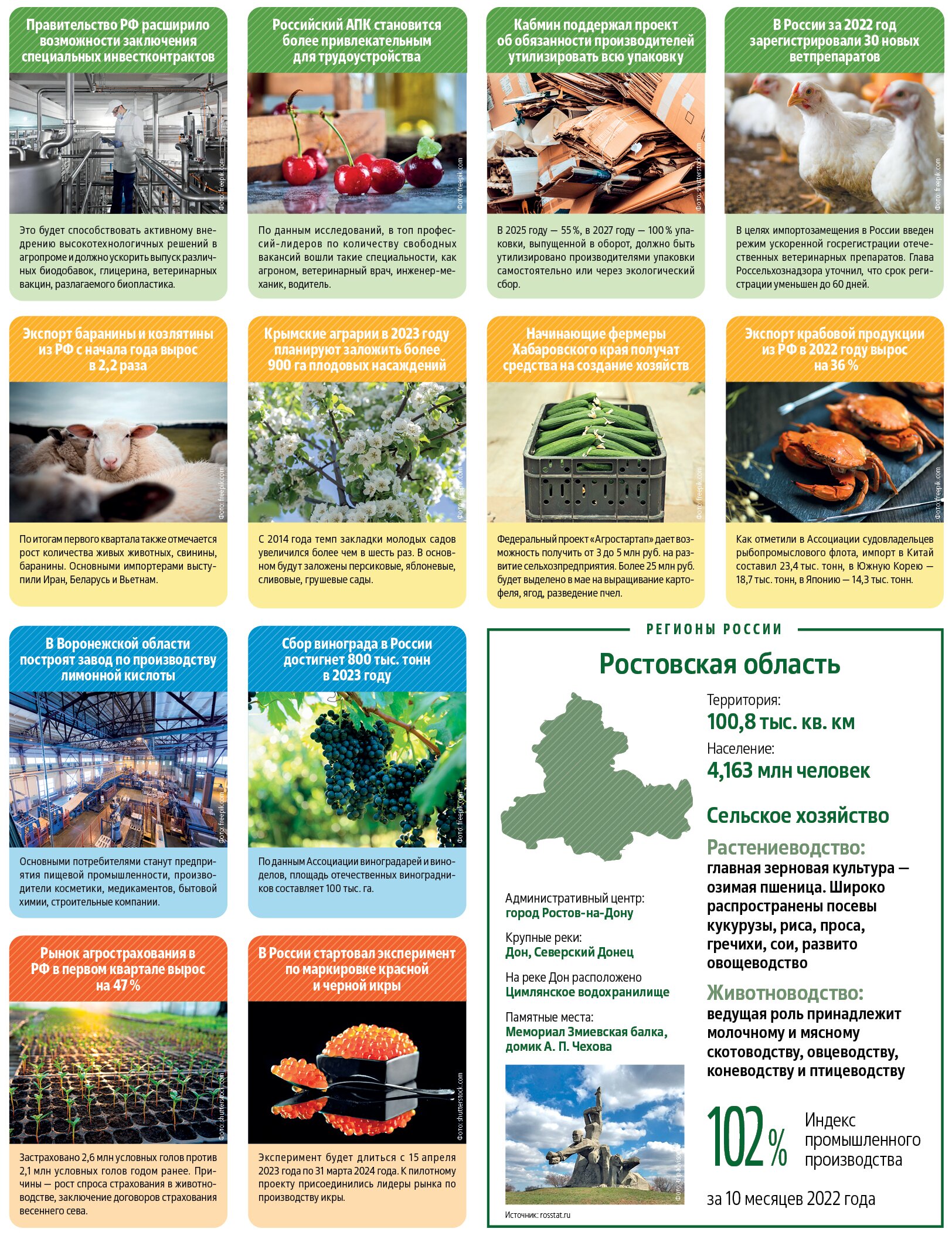 Новости в агропромышленной сфере: отечественные сельхозпроизводители вышли со своей продукцией на освободившийся рынок, Правительством обеспечиваются условия для агроинвестиций и создания фермерских хозяйств, меняются стандарты в области экологии и регистрации ветпрепаратов, наметились основные тренды рынка труда, строятся новые заводы, увеличиваются площади отечественных садов.