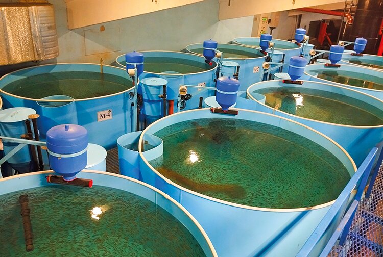 По мере того как мальки подрастают, их перемещают из ясельного отделения в общее помещение. Его тоже можно сравнить с детским садом — рыбья малышня живет в отдельных бассейнах по возрасту и размеру. Несмотря на то, что уход за рыбой сильно отличается от присмотра за другими животными, есть и много похожего. Например, частые уборки. Когда выращивают телят или поросят, им меняют подстилку и чистят стойла. В случае с мальками все, в сущности, так же.